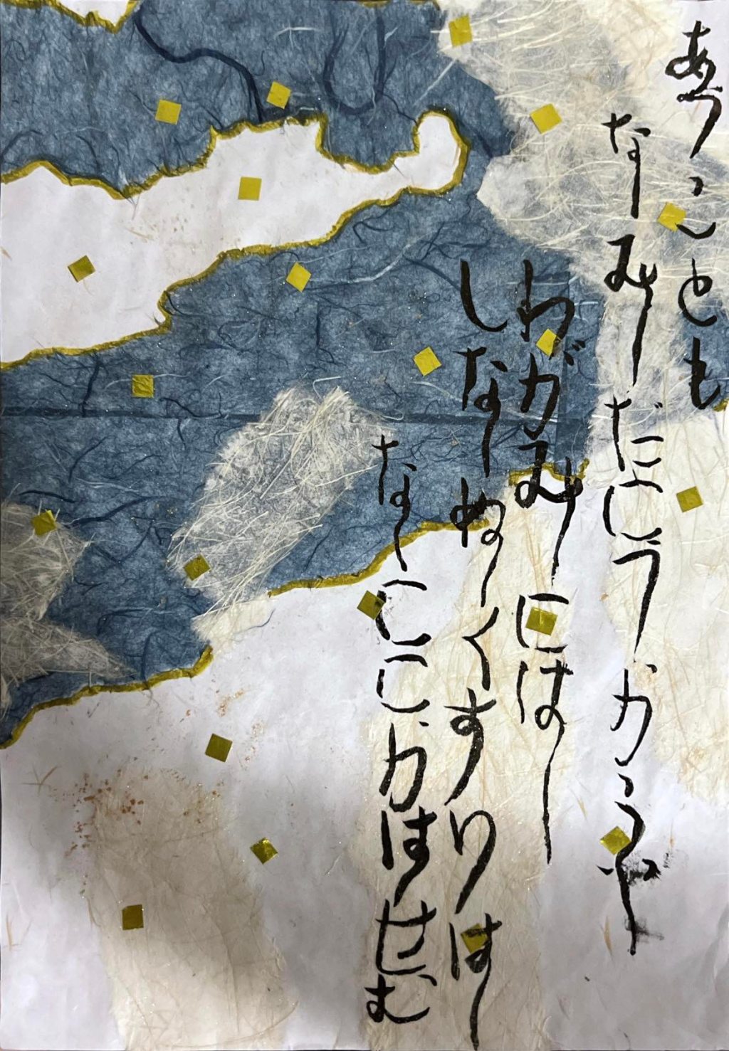 This poem I chose to display on a chigiri-e collage page using the onna-de calligraphy techniques and these were often used together. Chigiri-e is using torn and cut mulberry paper to create a picture similar to a water colour painting. This is often further embellished with ink painting of pictures or outlines as well as gold and silver leaf and mica powder. A picture may be created that is related to the text that is on the page or may be of a more abstract nature.