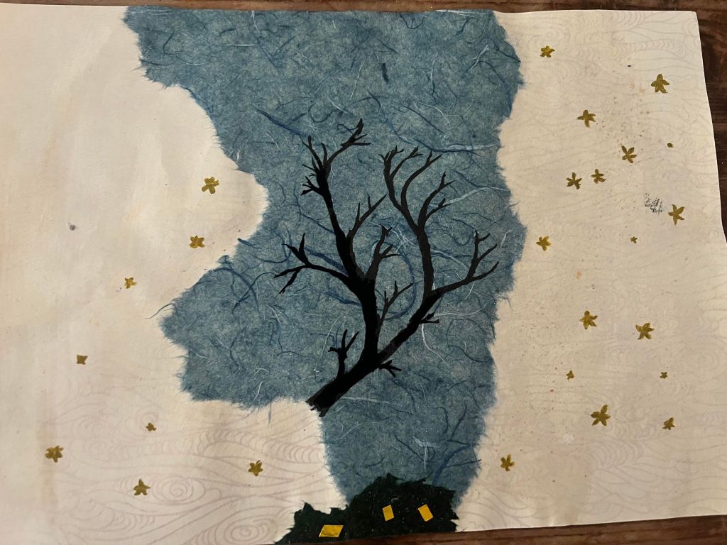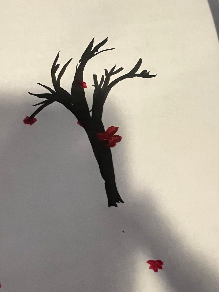 The tree will be a cherry blossom tree, the trunk is drawn in ink. I am in the process of experimenting with paint so that the blossoms are opaque against the tree trunk.