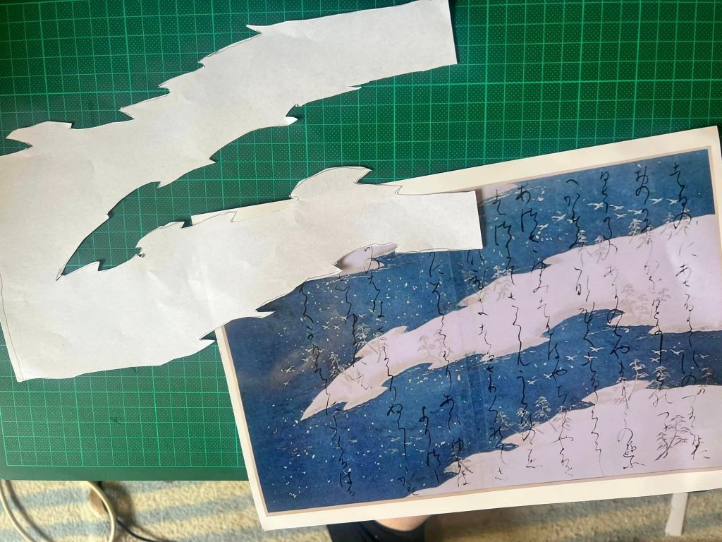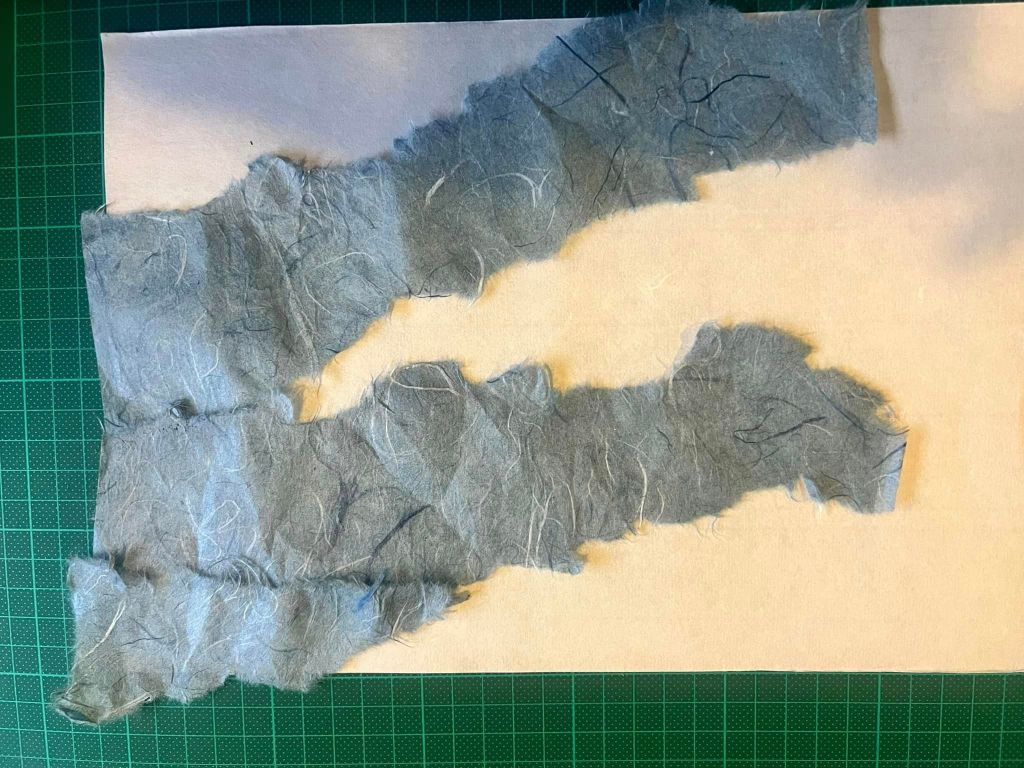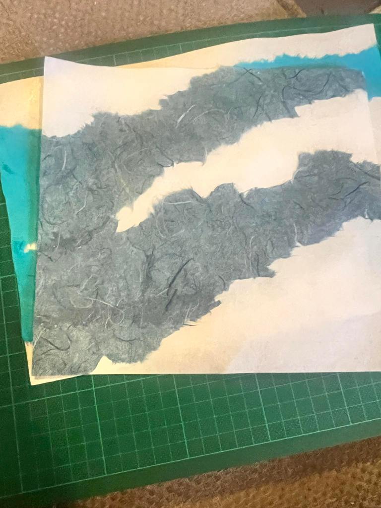 I then used the template as guide to perforate and tear the paper, as I did in the Ise hills piece. For this I have decided to do two pieces in two different colours to see the effect, one in the regular blue and the other in sky blue. I only managed to get a picture of the regular blue one with the pieces
